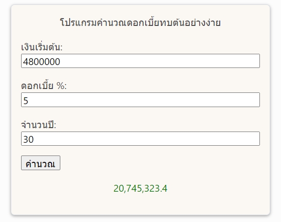 (เราแปะลิ้งค์คิดคำนวนทบต้นให้ตามนี้เลยครับ ใส่ เลขเงินปัจจุบัน จำนวนปี ดอกเบี้ย) https://blog.kpping.me/posts/%E0%B8%84%E0%B8%B3%E0%B8%99%E0%B8%A7%E0%B8%93%E0%B8%94%E0%B8%AD%E0%B8%81%E0%B9%80%E0%B8%9A%E0%B8%B5%E0%B9%89%E0%B8%A2%E0%B8%97%E0%B8%9A%E0%B8%95%E0%B9%89%E0%B8%99/